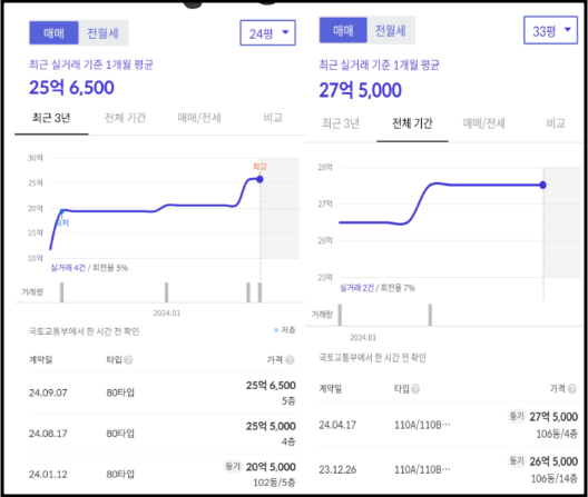 바로 근처의 대치르엘의 실거래가를 보면 25평이 25억 6500만 원, 33평이 27억 5000입니다.