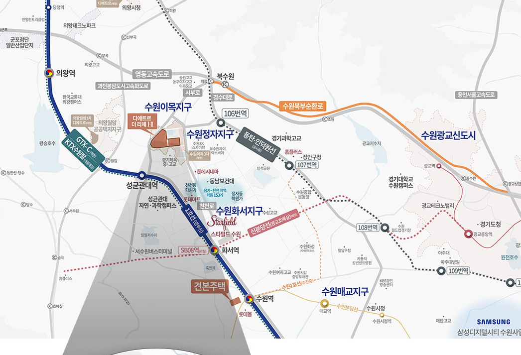 서울과 가까운 광역 교통망으로 영동고속도로, 과천봉담 고속도로 1번 국도 등 어디든 빠르게 갈 수가 있습니다.