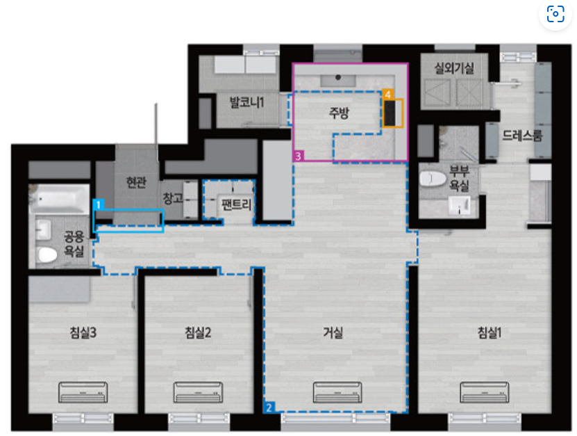 포레나영흥숲의 먼 적은 전용 66~84의 구조입니다.