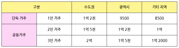 단, 전세금은 단독 거주자는 호장 지원한도액의 150% 이내, 공동거주자는 호당 지원한도액의 200% 이내로 제한합니다.