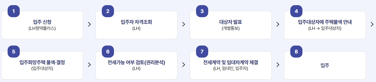 - 모집공고 확인하기 -> 2. 온라인 신청하기 -> 3. 자격심사 -> 4. 입주대상자 선정 및 통보 -> 5. 주택 물색 및 선정 통보하기 -> 6. 전세 계약 체결 -> 7. 입주하기
